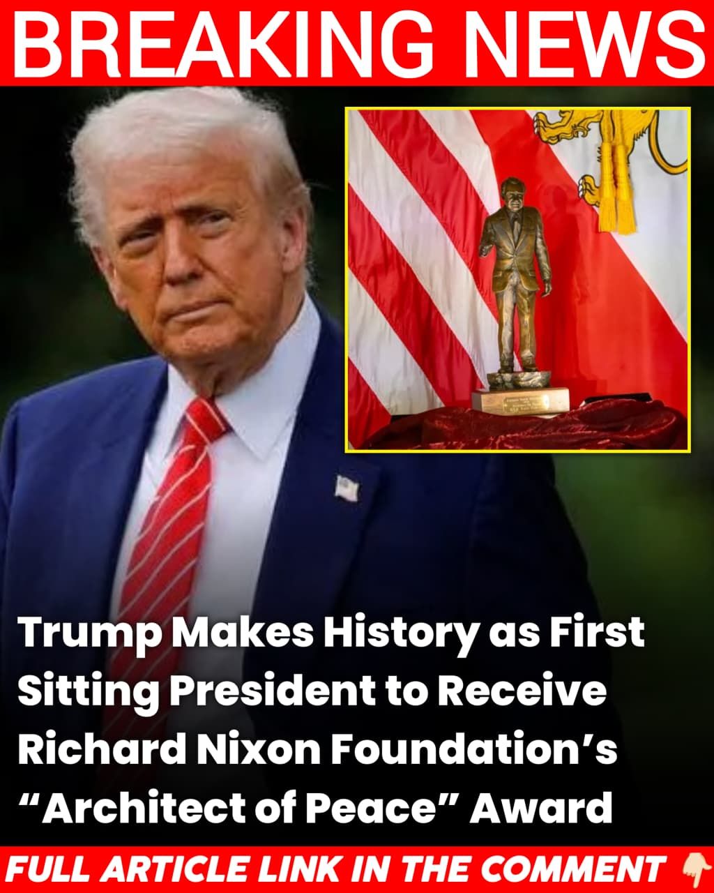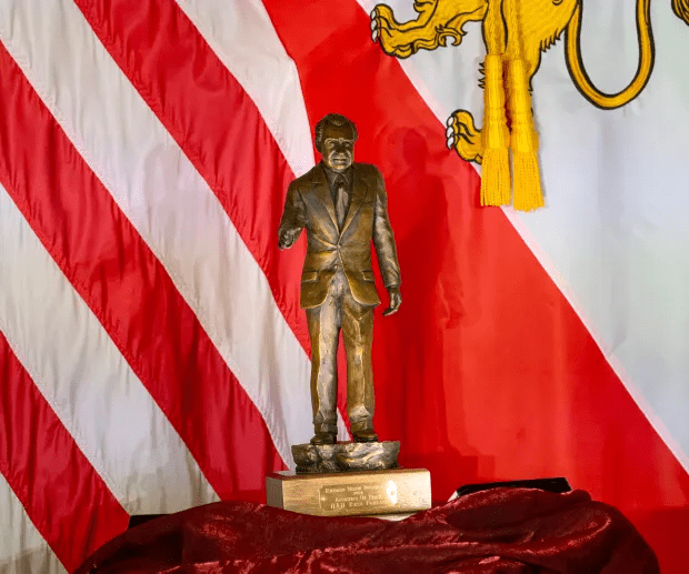 The announcement, first reported by RealClearPolitics’ Philip Wegmann, was accompanied by striking images of Trump smiling confidently in a navy suit alongside the bronze Nixon statue trophy displayed against an American flag. For supporters and political observers alike, the symbolism was unmistakable — two presidents, decades apart, bound by a shared vision of American leadership and pragmatic diplomacy.